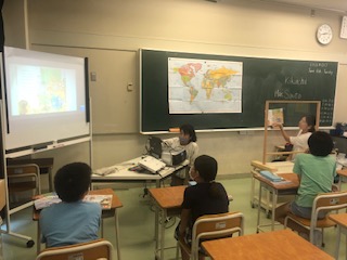左の写真は5年生の外国語の学習です。今年から新たに英語の専科教員の配置を得ました。読み聞かせをしている英語活動支援員の前に置いてあるアクリルの衝立は、本校の用務主事の手作りです。