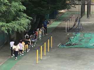 1年生が「グリーンロード」を歩いてBOP棟2階の絵本の部屋に移動しています。北校舎からBOP棟に続く緑のゴム製の道は、平成30年度に地域の一般財団法人材料科学技術振興財団から寄贈いただいたものです。この「グリーンロード」ができるまでは、1年生やひまわり学級の児童が絵本の部屋や「つながるーむ」、体育館などを往復するためには常に中央昇降口や職員室・保健室前や西昇降口など校舎の1階をぐるーっと回っていました。「グリーンロード」という近道ができてとても助かっています。いつまでも大切に使わせていただきます。