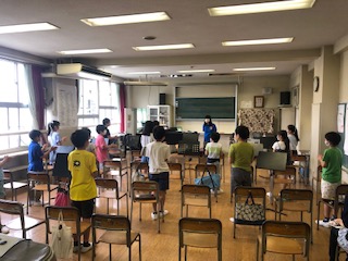 右の写真は高学年音楽室です。5年生が音楽授業の導入でリズム打ちを楽しんでいる場面です。