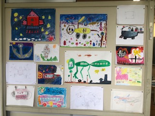 左の写真は、3年生の廊下の掲示板です。臨時休業中の作品が並び、展覧会のようです。絵の裏には子どもたちの思いが書かれています。タイトルは「ふしぎな乗り物」です。