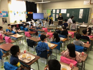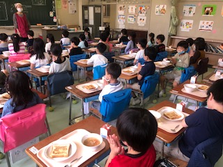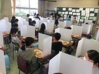 今週は配膳は教職員が行います。写真は、最初の2枚が1年生、右が6年生の教室のようすです。1年生には小1サポーターやすまいるルームの教員等が、2年生には専科教員が配膳の手伝いに入りました。どの学年の教室でも子どもたちは静かに食べていました。新しい生活様式に取り組んでいる姿に感心しました。