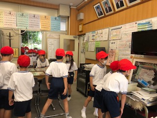 1年生と2年生の今日の生活科のようすをご紹介します。最初の写真は、1年生の学校探検です。今日も1年生が校長室にやってきました。近頃は、生活科の授業時間だけでなく、5分休みや中休みに校長室を再度探検に来る子どもたちが増えてきています。航空写真や蝶の標本、防犯カメラの画像や歴代校長の写真などに見入っています。