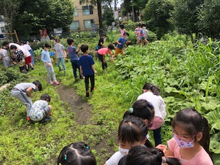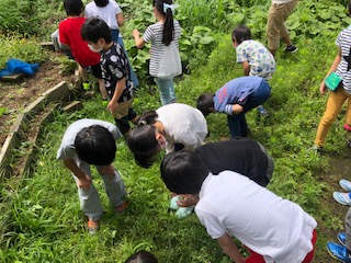 右の2枚は、2年生の生活科「めざせ生き物はかせ」で虫探しをしているようすです。東校舎裏には校内ながらこんなに緑豊かなスペースがあります。明正公園に隣接するエリアです。バッタの赤ちゃんを見つけて歓声をあげていました。虫探しをする姿勢がどんどん低く変わっていきます。夢中になり集中して探しては、級友と情報を交換し合う主体的な姿に出会うことができました。