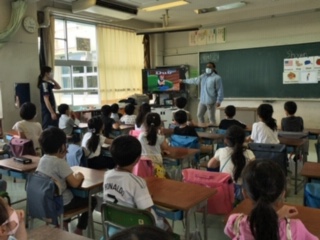 本校では5年生と6年生の「外国語」の学習は、英語専科の教員と英語活動支援員が協力教授で指導しています。3年生と4年生の「外国語活動」の学習は英語専科の教員とALTが、そして1年生と2年生とひまわり学級の「外国語活動」は担任とALTが、いずれも協力教授で指導しています。左の写真は、2年生の外国語活動のようすです。ポケモンの主人公の名前が日本とアメリカでは異なることを知って、子どもたちがALTの話に聞き入っている場面です。