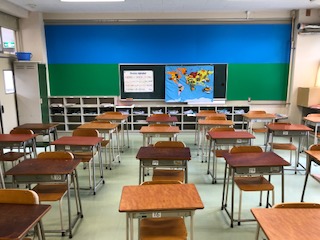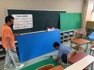 右の2枚の写真は、放課後に外国語や外国語活動の教室の環境改善をしているようすです。西校舎の1階、昨年度は「たまりばルーム」として多目的にスペースを活用していた教室です。ここで外国語や外国語活動の学習が週に24時間展開しています。不要な暖房機を取り外すとともに、教室背面の掲示板にカラーのプラスチック段ボールを打ち付けて、画鋲を使わなくてもダイナミックな掲示ができるスペースを作りました。この教室は、多様性や異文化理解・国際交流などの発信・共感の場としたいと考えています。教室名はタッチ・ザ・ワールドです。教育センターの同じ名前のコーナーのように、子どもたちが広い世界に触れるきっかけづくりとなることを目指してまいります。”MEISEI Touch the World”として親しんでいただけるよう整備を進めます。