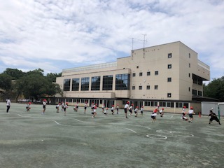 梅雨の晴れ間の月曜日、校庭では各学年が密集を避けながら体育や生活科、理科などの学習を展開しています。熱中症予防のため、熱中症指数計で確認しながらの授業です。