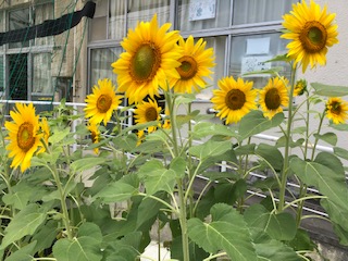 ひまわり学級の前の花壇のヒマワリは、こんなにたくさん開花しています。