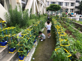 さて、1年生がアサガオに水をあげています。実は昨日、昼休みの暑い時間帯に熱心に水をあげている姿を見て、「あまりに暑い時は植木鉢の中も暑くなってせっかくの水がお湯になってしまい根っこが弱ってしまう心配がある」と話をしたのです。「今日は涼しいから安心していっぱいお水をあげるんだ」とお世話をしていました。つぼみが大きくなってきたことや咲いた花の色のことなど、いろいろなお話をしてくれます。