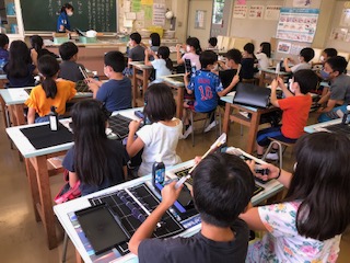 右の写真は3年国語の毛筆書写です。3年生からは書写に毛筆が加わります。習字道具の一つ一つを確かめながら、準備をしている場面です。3年生は毛筆書写と教科日本語は専科教員が指導をしています。
