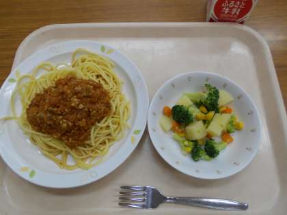 ヘルシーミートソーススパゲティ マセドアンサラダ 牛乳