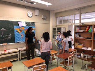 ALTの少年の頃の体験談に聞き入っていた子どもたちは、どのような思いをもったのでしょうか。外国に行くことを怖がり過ぎる必要はないが、気をつけることは必要だというメッセージもありました。授業終了後には自然にALTに周りに輪ができていました。