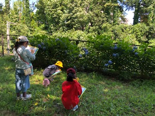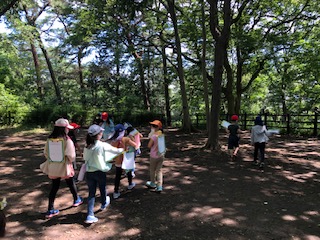 2年生と一緒に生活科の学習で成城三丁目緑地に出かけました。各自が持っているのは生き物探しのビンゴカードです。ビンゴの枠線だけが印刷されたカードに、思い思いに気付きを描いています。今日は日差しが強い1日でしたが、里山は涼しいです。感心なことに、みんな里山ファッションを身につけています。学びに向かう姿勢が準備万端であることがよくわかります。身近に豊かな自然環境が保全されていることの尊さを感じます。ありがたいことです。
