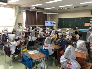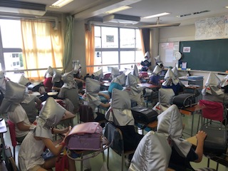 6年生は、社会科で震災や復興について学んできたところでの今回の訓練となりました。4年生は大型テレビで「ダンゴムシのポーズ」「サルのポーズ」を確認している場面です。1年生は、机の下に入って机の対角する足をしっかりと持っています。これが「サルのポーズ」です。避難訓練は「練習」でなく、自分の命を自分で守る行動を身に付ける「訓練」です。