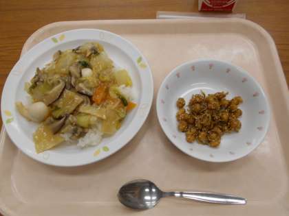 中華丼 大豆とじゃこのあまからあげ 牛乳