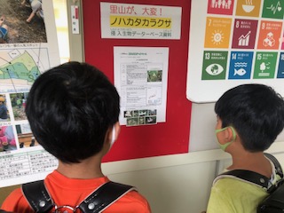 左の写真は、校長室廊下の掲示板を見に来た3年生です。国立環境研究所の侵入生物データベースを読んでいます。右は里山で撮影したノハカタカラクサです。「きよみづばし」の近くにたくさん繁茂していました。湧水の流れがあり足元がぬかるんでいるので注意が必要です。木曜日にコア会議の方々と打ち合わせをしてきます。