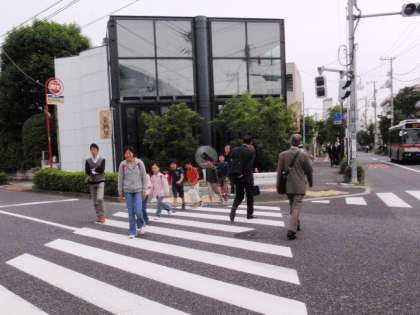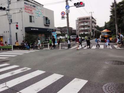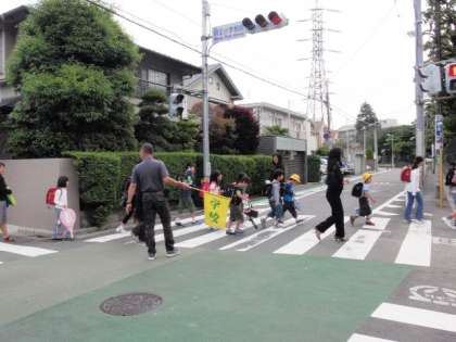 今朝は、成城町の信号、病院坂上の信号に出ました。信号機が付いている横断歩道ですが、朝の通勤時間帯ということもあり、かなりの車が走っていました。子どもたちは、信号をよく見て渡っています。先生たちが青いのぼりをもって信号のところに立っていると車の運転手さんも気を使ってくれているのがわかります。