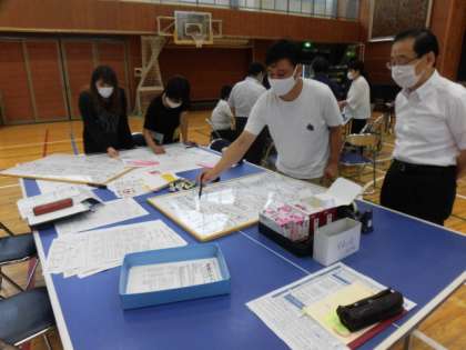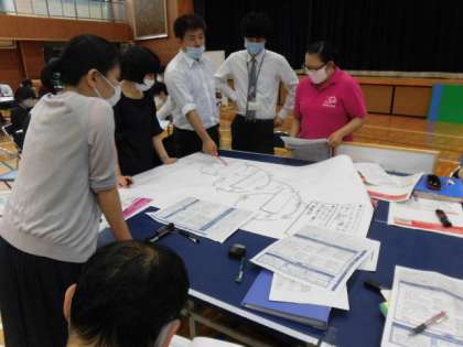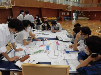 放課後、体育館で校内研究会を行いました。本校の今年の研究主題は「主体的に課題解決する児童の育成」です。深い学びを実現するための指導の工夫を明らかにすることをとおして研究を進めます。写真は、学年別の分科会協議のようすです。目指す児童像や児童に育てたい資質・能力について協議し、生活科や総合的な学習の時間の単元イメージを可視化しているところです。児童が主体的・対話的に学びを展開する「探究的な学習の過程」を構想して図に表わしている場面です。昨年・一昨年度に続き、今年も講師 寺崎千秋氏の指導のもと、校内研究に取り組んでまいります。
