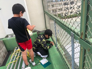左の写真は、4年国語「学校新聞を作ろう」の取材と実測のようすです。この2人が関心をもって取材しているのは校庭に設置している「投げるくん」です。投擲の運動遊びのための手作り用具である「投げるくん」のロープの長さを知りたいと言うので、用務主事にも応援を依頼して一緒に実測することにしました。ロープを結びつけている屋上フェンスから巻尺を校庭に垂らしてから校庭に行き、ロープに沿って巻尺をタイヤまで引っ張り、再度屋上に戻って長さを読み取っている場面です。この角度からは全体の様子をご紹介できないのですが、4年生の教室からはこの実測のようすがよく見えたそうです。級友たちが気付いてくれたことを後から聞き、嬉しく思いました。巻尺が木に引っかかって苦労する場面もありましたが、知りたいことを自分たちで実際に知るための手立てを考えて実行して「ロープの長さ」の数値を手に入れたのです。喜びに満ち溢れていました。屋上を移動して、もう一基の「投げるくん」のロープも実測しました。課題解決という学びに向かう力が発揮されていました。