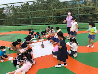 中央の写真も屋上です。3年理科「かげと太陽」の学習のようすです。時間がたつと影の向きと太陽の動きはどのように変わるか、屋上に模造紙をひろげて調べて記録している場面です。先週は雨が続いていましたので今日は絶好の観察日和でした。学年4クラスが協力して、1日かけて記録を取りました。