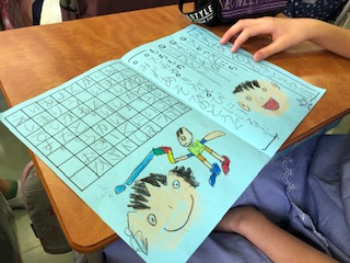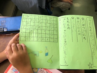 左の写真は、6年生の教室でお礼とお誘いを述べている1年生のようすです。なんのお誘いでしょうか? カードから読み取っていただければ幸いです。では、なんのお礼でしょうか。それは体力テストの反復横跳びの補助や応援をしてくれたお礼です。生活科「みんなであそぼう なつ」や体力テスト後の「がっこうたんけん」での校舎3階探検など、子どもたちの発見や気付き、思いや願いを引き出しふくらませて、6年生との「なかよしいっぱいだいさくせん」につながってきているのです。生活科は教科書通りに進めるのでなく、子どもたちが主役になって自立し生活を豊かにしていくストーリーを担任がさりげなく紡いでいくことが大切です。願いや思いがかなっていく生活科の展開に今後もご期待ください。