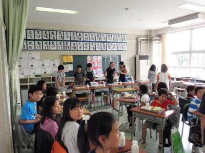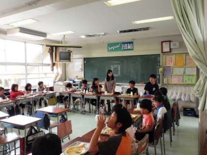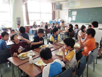 今年度1回目の縦割り給食を実施しました。全校が28の班に分かれての給食です。今日は初めてなので、自己紹介もしました。メニューは子ども達の大好きなカレーライスです。どの班もたくさん食べたので、食缶はきれいになって給食室に戻ったようです。