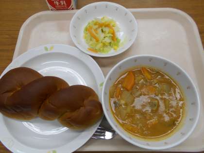 黒砂糖パン ハンガリアンシチュー コーンサラダ 牛乳