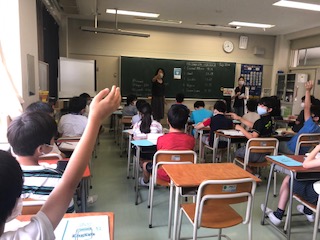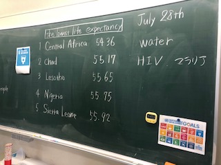 右の2枚の写真は、6年外国語の学習のようすです。数字の表現の仕方を学ぶとともに、題材を通して世界の現状への理解を深めています。今回は前回に引き続き「世界の平均寿命」を世界を見る「窓」にして、SDGsの6番目の水問題に迫る展開です。現実の世界に向き合う内容です。自分なりの予想を立て、動画からキーワードや情報を得て思考しています。動画では、家族のための水汲みに1日8時間かけて徒歩で往復する子どもの生活が紹介されていました。