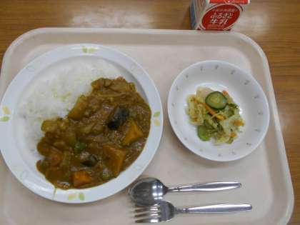 夏野菜のカレーライス こんにゃくサラダ 牛乳
