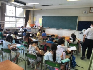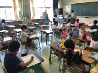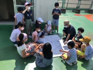写真は左から、1・2・3年の学習のようすです。3年生は教室から屋上に移動して方位磁針に合わせて地図を置き直している場面です。この後、屋上全体に散らばって学校から見える特徴ある建物などと地図とを比べながら「謎解き」が始まりました。