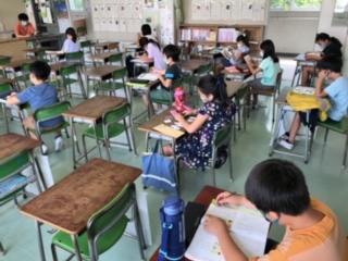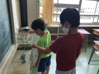 写真は左と中央が5年、右が4年の教室のようすです。5年生の中には前回に引き続き顕微鏡での観察に取り組んでいるグループがありました。池や水槽など様々な場所から水を採取してきて比較していました。
