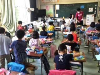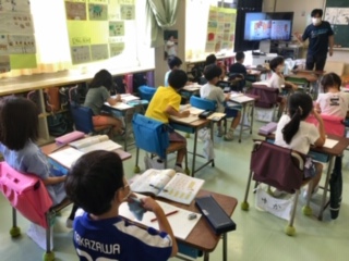 中央の写真は1年の算数「10より大きい数」の学習のようすです。トンボの絵を見て10ごとのまとまりをつくって数を確認している場面です。