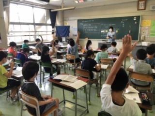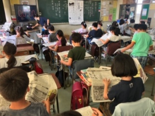 中央の写真は5年国語「新聞を読もう」の学習のようすです。新聞の構成を学んでいる場面です。多様な面があることに気付くことを期待して大きな数字探しに取り組み競い合っています。素晴らしい集中力で目が記事を追っています。今後は新聞記事の内容の比較の学習に展開する予定です。