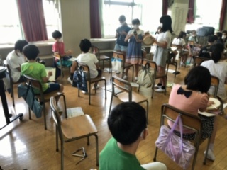 右は5年音楽「打楽器でリズムアンサンブル」の学習のようすです。マラカス・鈴・タンバリン・ギロ・クラベス・カウベル・ウッドブロック・カスタネット・小太鼓など、金属・革・木でできた打楽器でアンサンブルを楽しんでいる場面です。