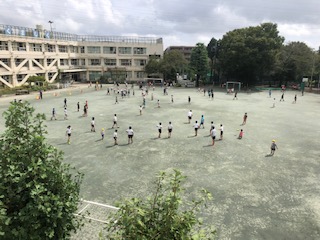 登校時間に激しい雨が降ったので校庭には水たまりができています。それをよけながら上手に遊んでいます。