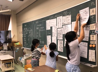 4年生は、昨年3年生で年間を通して取り組んだ総合的な学習の時間「地域の人となかよくなって一緒に○○しよう」で関わったり協力していただいたりした地域の人たちについて思い出しながら学びの振り返りをしたうえで、4年になってからみんなが関心をもっていることとつなげて「4年生の総合的な学習の時間ではどんな課題解決に取り組んでいきたいか」と考えを出し合っている場面です。一人一人が考えをマグネットシートに書いて黒板に貼り、意見交流をしています。初めから正解があるわけではないし、答えは一つではないのです。そこが集団で学ぶ意義であり尊いところです。