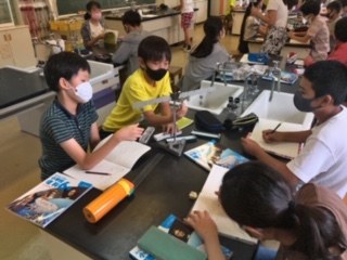 左の写真は6年理科「てこのしくみとはたらき」の学習のようすです。てこが水平につり合う時のきまりを調べるために実験をして表にまとめている場面です。