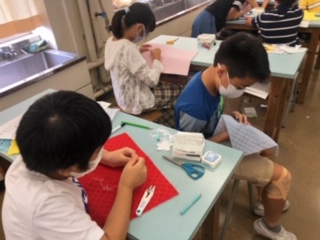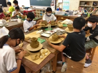 右の写真は6年図画工作「ドキドキ縄文土器」の学習のようすです。縄文土器(中期〜火焔)の装飾の特徴を自分の作品に生かすことをめあてに取り組んでいます。