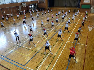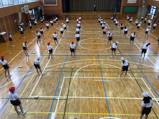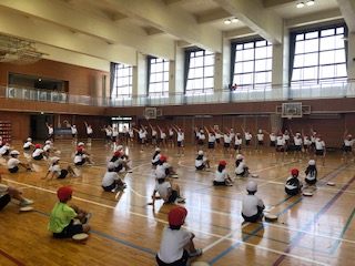 体育館で4年の2クラスが合同で体育学習をしているようすです。左の写真はコオーディネーショントレーニングの「くの字」「Sの字」運動の切り替えを準備運動に取り入れている場面です。「くの字」なのか「S の字」なのか音の変化を聞き取って自分で判断して動きを切り替えます。集中して取り組んでいることが後ろ姿から伝わってきます。担任のお手本を見て真似して動きを変えるのでなく、自分で音の変化を聞き取って動きを変える、ということがとても大事なのです。