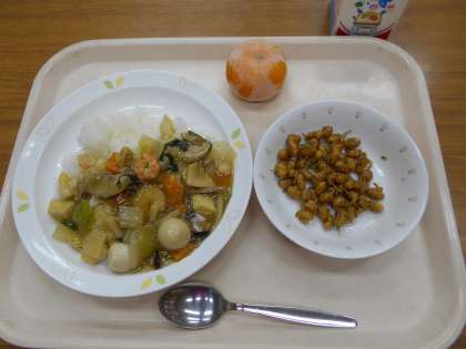 中華丼 大豆とじゃこの甘辛あげ 冷凍みかん 牛乳