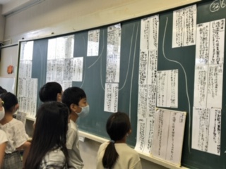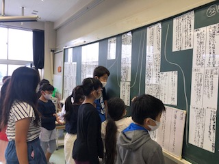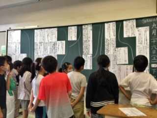 4年総合的な学習の時間「身近な環境」の学習のようすです。地域の人とどんな活動をしたいか、各自の思いを理由がわかるようにホワイトボードシートに書いて黒板に貼り、じっくりと読み合っている場面です。