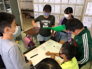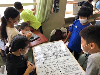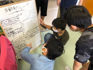 5年総合的な学習の時間「コロナで困っている人のために私たちができることを考え伝え合おう」のようすです。先ほどと同じクラスの別のグループをご紹介します。写真左から、働く人グループ、高齢者グループ、外国人グループです。授業後半になるとワールドカフェ形式で情報交換・質問・助言などが始まりました。
