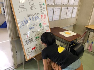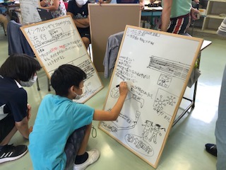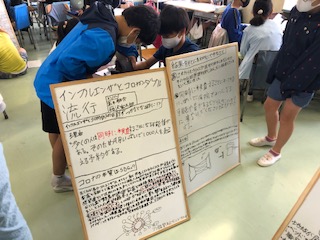 5年総合的な学習の時間「コロナで困っている人のために私たちができることを考えよう」の別のクラスの学習のようすです。こちらのクラスも新聞記事等やインターネット検索を活用して得た情報を取捨選択してホワイトボードにまとめています。「コロナの本質はSDGs」と言った見出しもありました。新型コロナウイルス感染症拡大について知的に理解することから探究的な学びが展開しています。