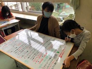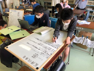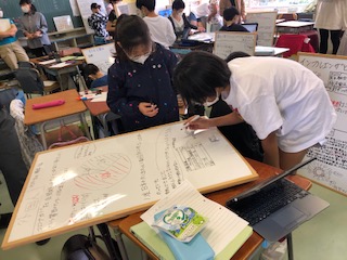 先ほどと同じクラスの別のグループをご紹介します。写真左から、観光業グループ、医療従事者グループ、外国人グループです。外国人グループは、外国語の学習で学んだBLM(Black Lives Matter)につながる視点をもっています。このクラスにはほかに、障害者グループ、幼児・乳幼児グループ、飲食店グループ、高齢者グループなどができています。どのグループの視点から探究を進めても実社会の持続可能性の課題に出会う展開となるようです。このクラスも授業後半はワールドカフェ形式で情報共有していました。
