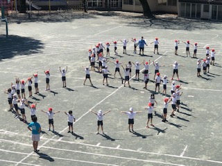 左の写真は1時間目の2年生の2学級、中央は2時間目の2年生の別の2学級、右は4時間目の5年生の2学級です。いずれも隊形移動のイメージが共有できるように練習していました。