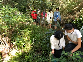 児童会委員会活動の時間に環境委員会の12人が成城三丁目緑地にノハカタカラクサの調査に行きました。「どうせ行くなら少しでも駆除をやってみよう」とのことで、大きなゴミ袋を数枚持って出かけました。
