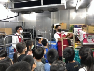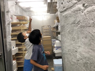 中央の写真は、冷凍庫を見学しているようすです。天井まで凍っていることにみんなとっても驚いていました。
