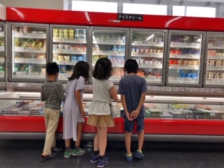 成城OKの店内の見学は、グループ単位で回らせていただきました。店員さんやお客さんのお邪魔にならないように気をつけながら、自分たちが見たかった視点や疑問の解決に取り組んでいました。左の写真ではトマトの種類を数えているところ、中央の写真はアイスクリームの品揃えを見ているところです。