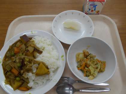 秋のカレーライス ごまドレッシングサラダ 梨 牛乳