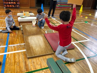 左と中央の写真は、風の力を利用しておもちゃを動かしているようすです。風を受ける部分を大きくしたり、車輪がスムーズに回転するようにシャフトになる部分でストローを活用したり、バランスを調整したり、動力となるうちわを大きく作り変えたりなど、それぞれの工夫と、そのお試しをしています。平らな床で楽しんでいた段階から、平均台や踏切板の坂道を上らせることに思いがふくらみ、大成功して喜んでいる姿がありました。