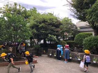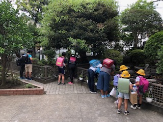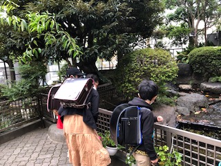 岩石庭園の池に仲間入りした金魚や鯉について土曜朝会の講話で紹介したところ、子どもたちが池のようすをよく見に来るようになりました。写真は今日の下校時間帯のようすです。毎日ちょこっとのぞいて帰る子もいるし、じっくりと長い時間観察している子もいます。先日仲間入りした赤い金魚はもとからいる黒い金魚と群れになって泳ぐなど活発です。白い鯉は橋の左奥の土管に入っていることが多いようですが、静かに待っていると尾びれが揺れているのが少し見えたり顔が見えたりすることがあります。新しく仲間になった魚たちの気持ちを想像しながら子どもたちが会話していることがうれしいです。池の環境に慣れて安心して泳ぎ回ってほしいとみんなが願っています。学校においでの際は保護者の皆様、地域の皆様もぜひ岩石庭園の池をそっと覗いてみていただければ幸いです。